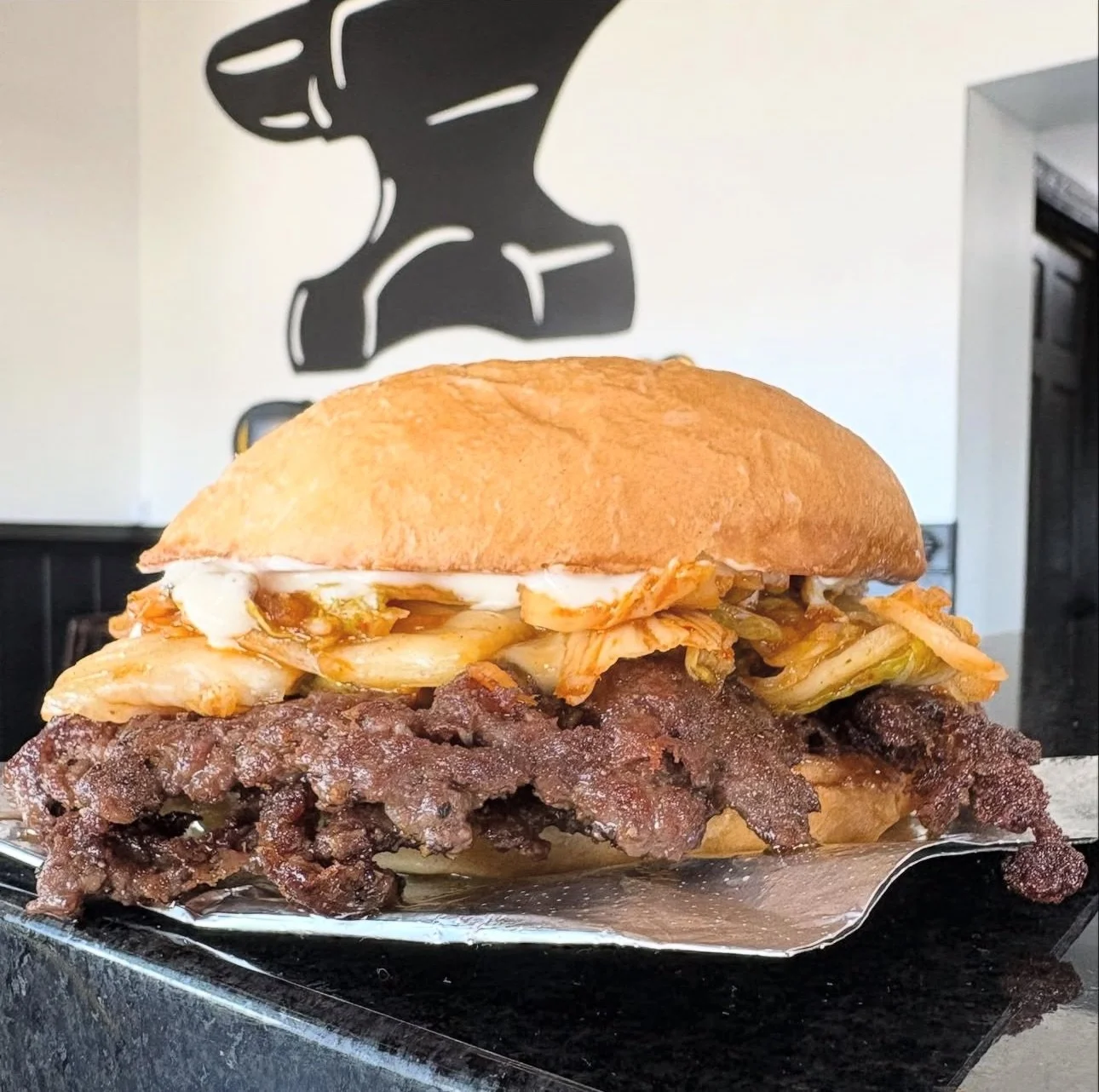 SEVEN HILLS BEEF PATTIES, WHITE AMERICAN CHEESE, KIMCHI, BLUGOGI MAYO