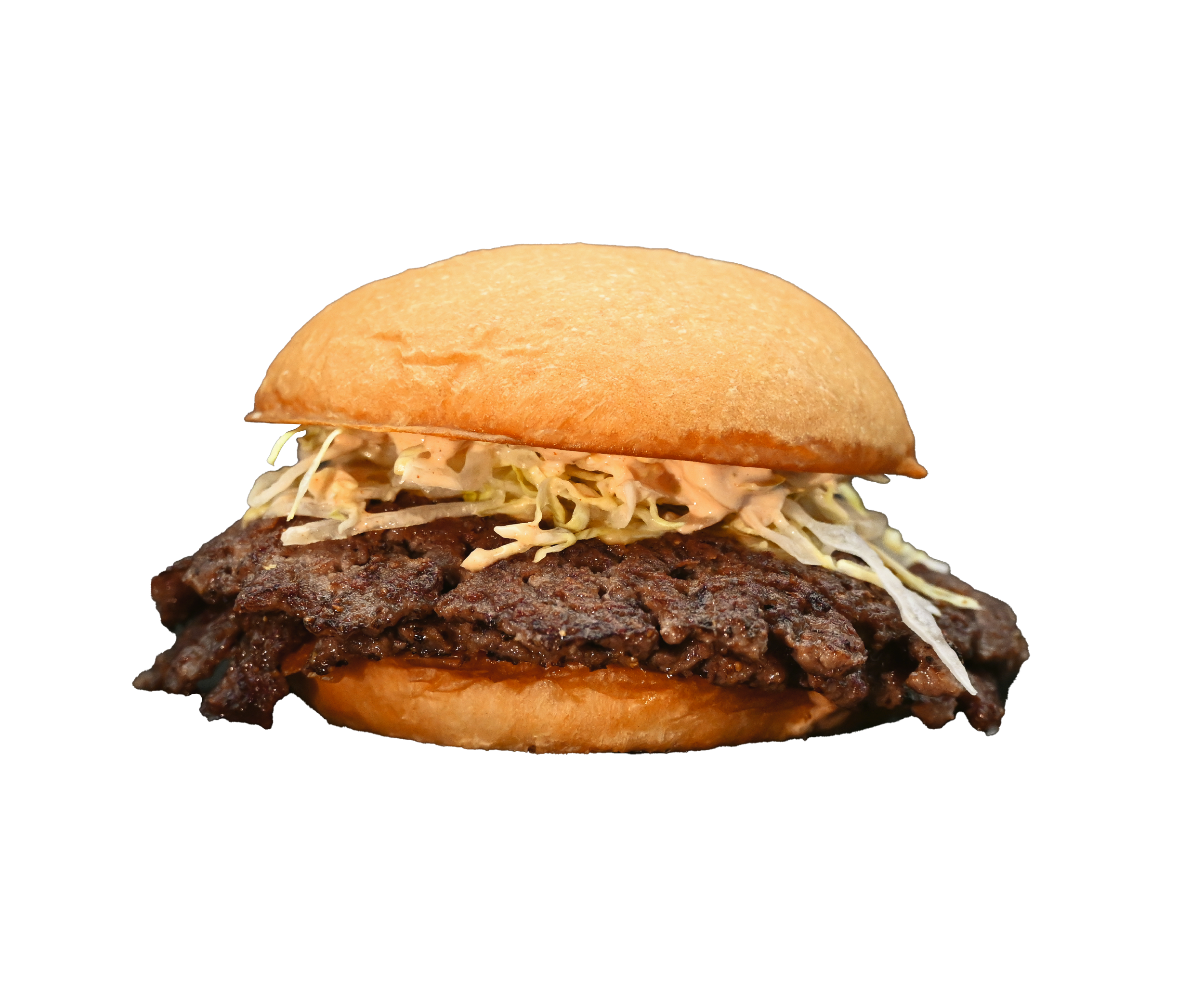 SEVEN HILLS BEEF PATTIES, WHITE AMERICAN CHEESE, KIMCHI, BLUGOGI MAYO